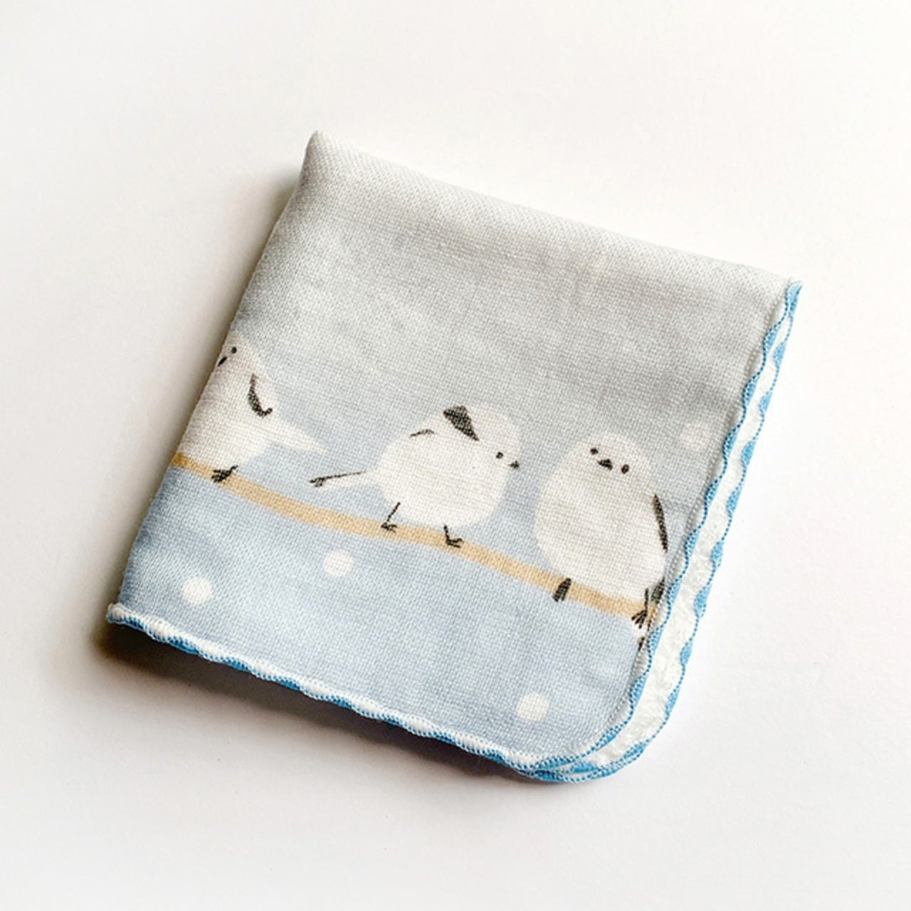 「タオルハンカチ / チャティーバード / シマエナガ / 雪の結晶」小鳥のハンドタオル / ガーゼとパイルの2重織 / 泉州タオル*ブルーグレーに水色の縁【残り僅か!】