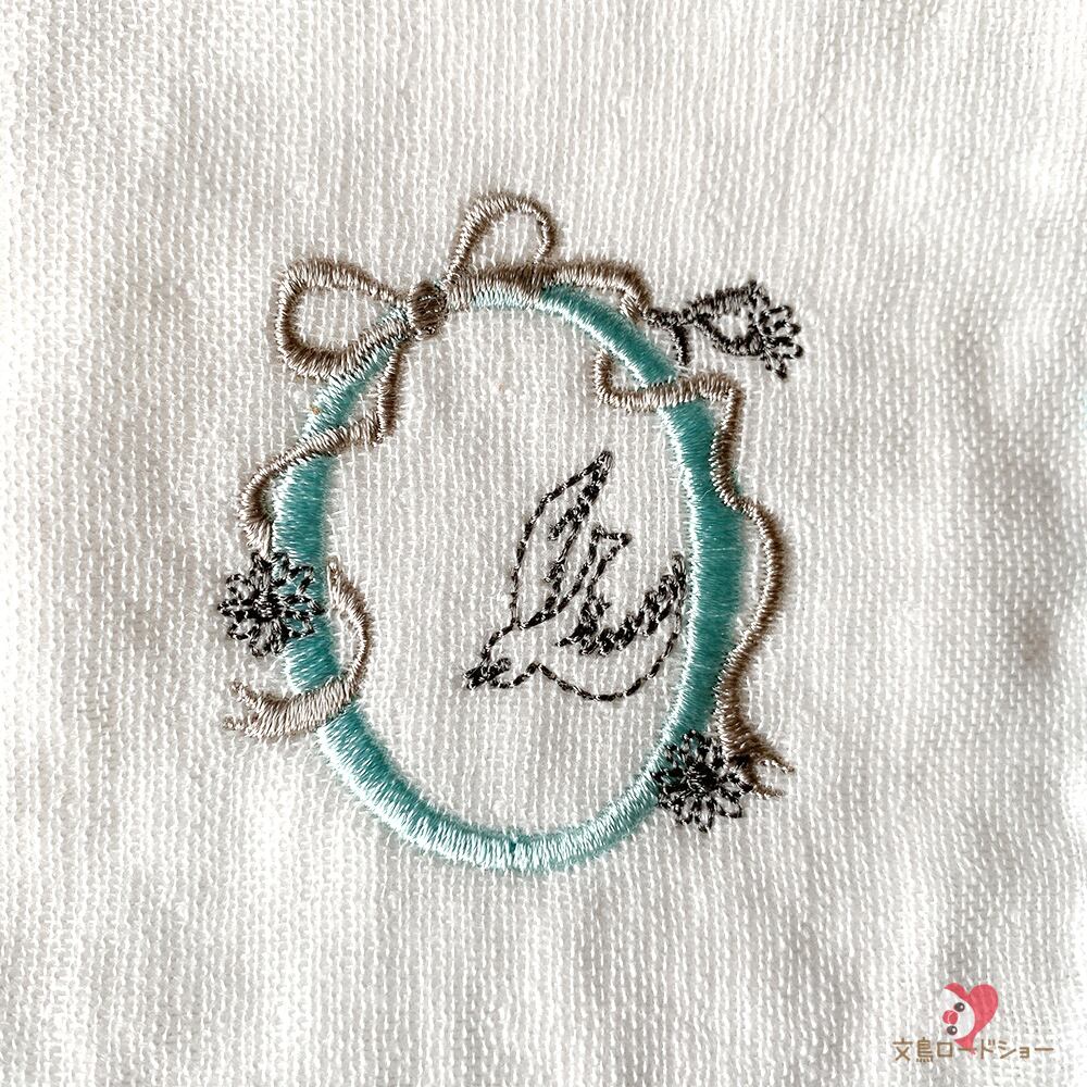 ●イニシャルO・・・水色のアルファベット「Oオー」に、リボンと小鳥の刺繍、水色の縁