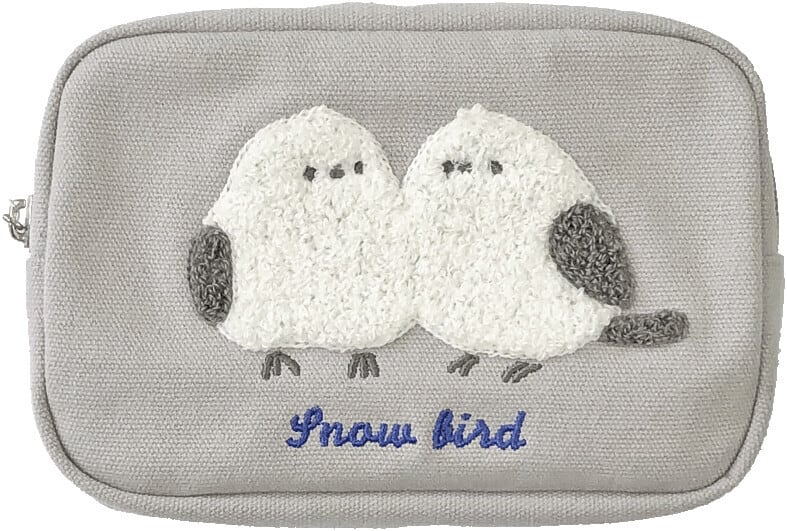 【ラス2!】「アニマルサガラ刺繍ポーチ / シマエナガ / グレー」立体シマエナガ刺繍のポーチ / くっつく2羽*ライトグレー【生産終了・在庫限り】