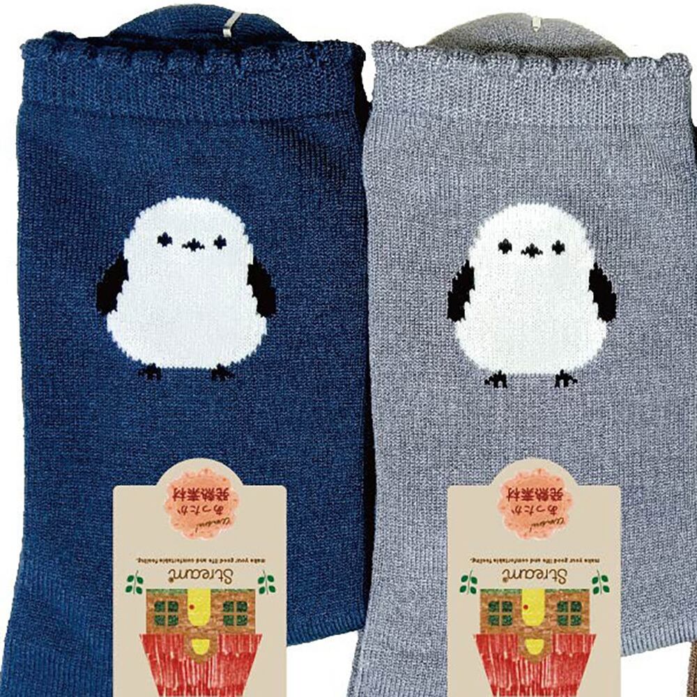 ぽってり1羽のシマエナガがちょこんと描かれた、あったか発熱素材のクルーソックス。