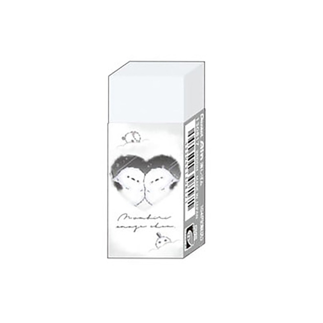 ハートの窓から覗く仲良しシマエナガたちがプリントされた、小さめサイズの消しゴム。